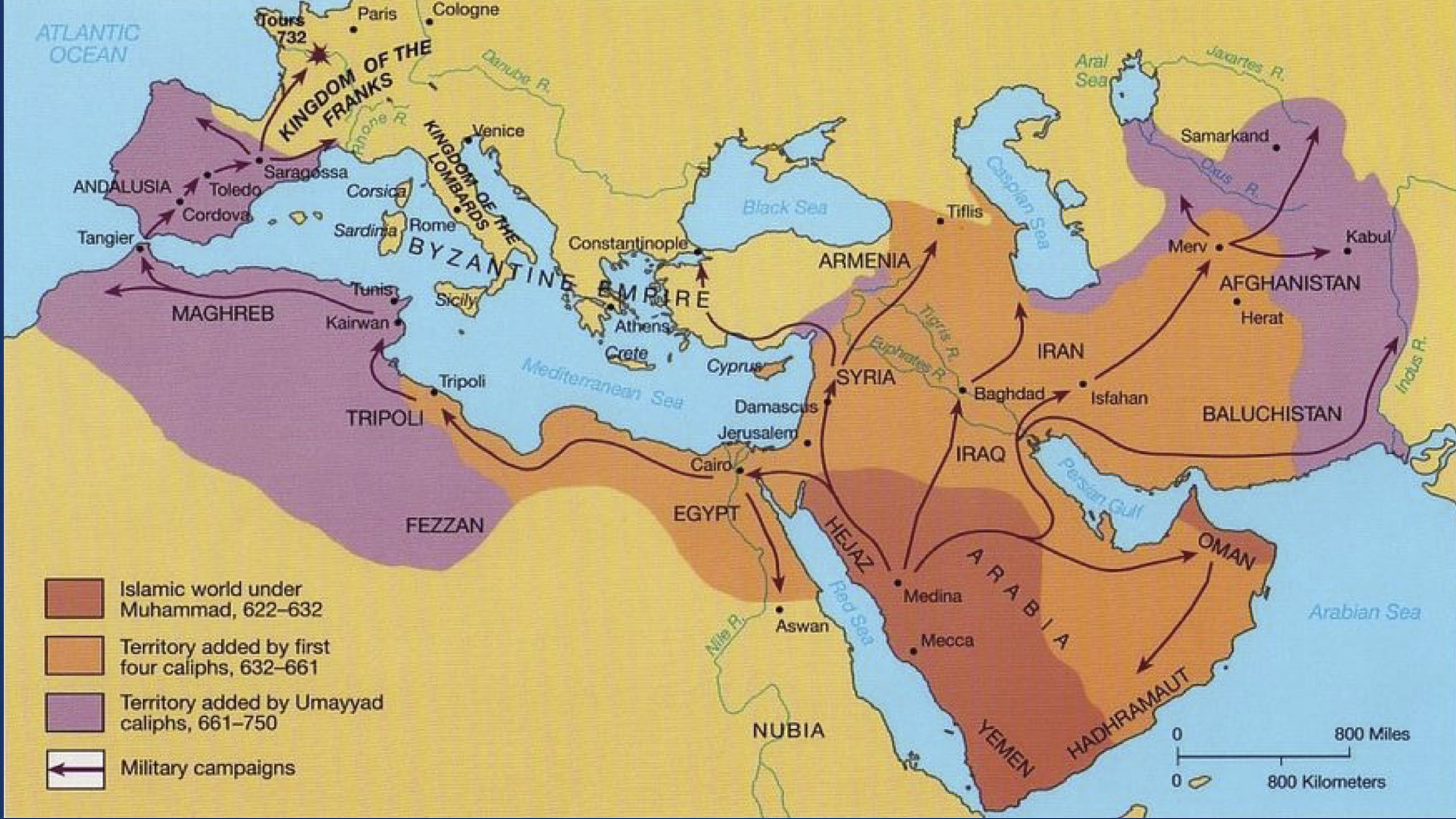 The Islamic world expanded significantly from the 7th until near the end of the 10th century, driven by extensive military conquests, trade, and cultural exchanges. This period saw the establishment of powerful caliphates and the spread of Islam across three continents: Asia, Africa, and parts of Europe including Spain.